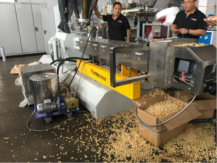 科爾克雙螺桿擠出機為多種食品和寵物食品的擠出提供了理想的條件。雙螺桿擠出機的工藝段由幾節內部帶有同向旋轉螺紋元件的筒體組成。緊密嚙合的自清潔螺桿元件消除了整個加工段的死區。這樣的設計確保了持續的高效輸送和完美的自清潔效果。